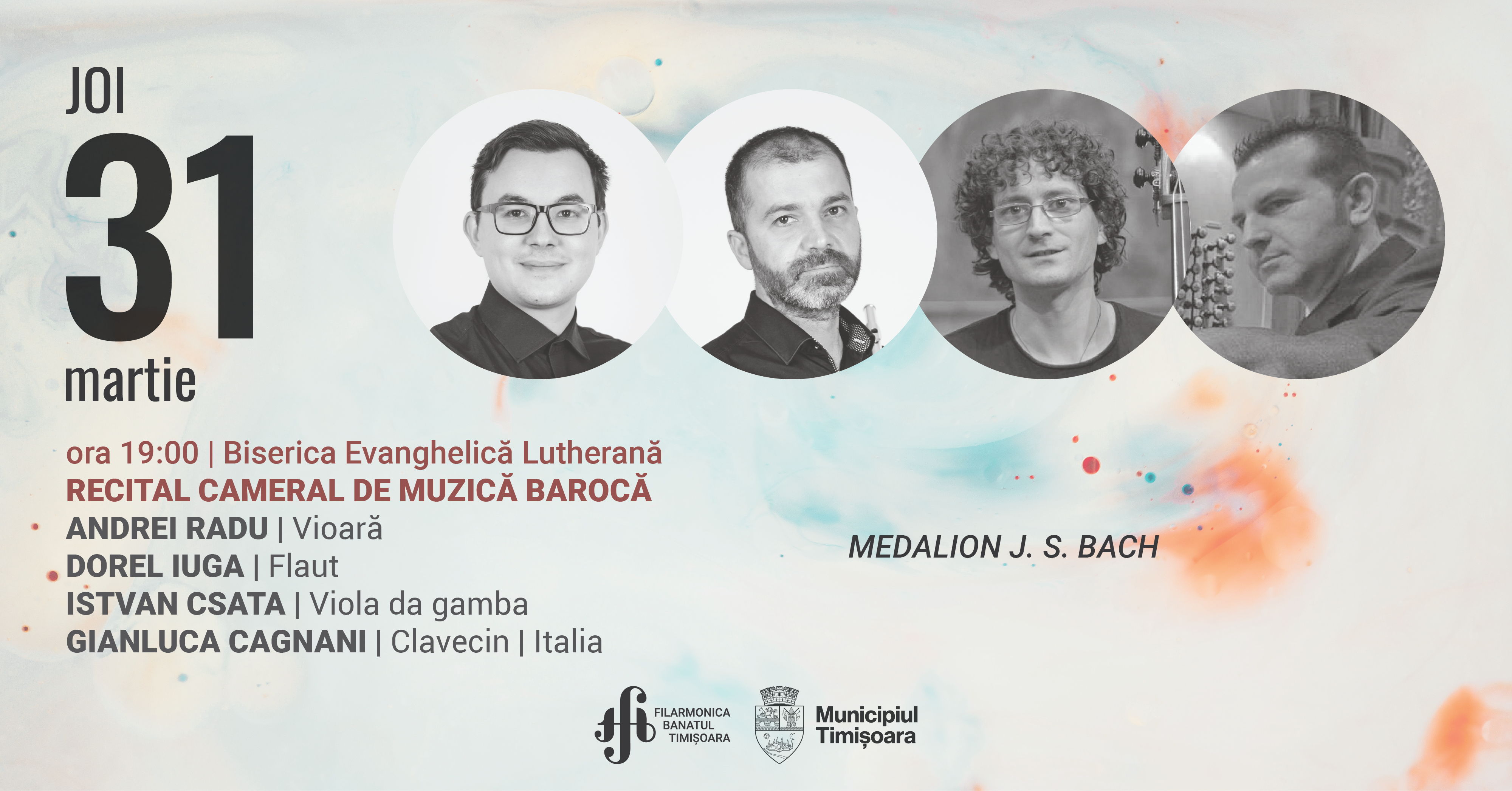 Întâlnirile muzicale din luna martie se încheie joi, 31 martie, ora 19, la Biserica Evanghelica Lutherană cu un recital cameral de muzică barocă susținut de Andrei Radu (vioară), Dorel Iuga (flaut), Istvan Csata (viola da gamba) și de Gianluca Cagnani (clavecin și conducerea muzicală).