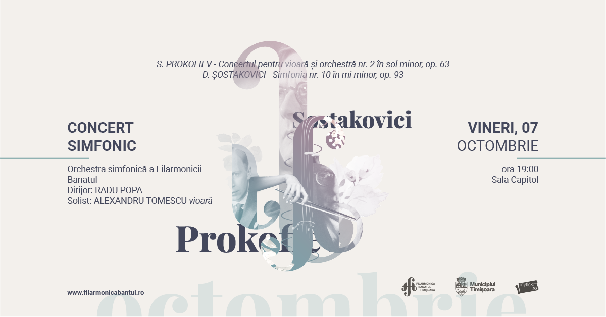 Concertul simfonic al Filarmonicii Banatul Timișoara, din 7 octombrie, conţine două lucrări: Concertul pentru vioară și orchestră nr. 2 în sol minor, op. 63 de Serghei Prokofiev şi Simfonia nr. 10 în mi minor. op. 93 de Dmitri Șostakovici. După 18 ani de la primul concert pentru vioară, în re major, Prokofiev compune Concertul nr. 2 pentru vioară şi orchestră în sol minor, op. 63. Scris în aceeaşi perioadă cu baletul „Romeo şi Julieta”, vom observa trăsături comune, un Prokofiev matur, dar şi mai reîntors spre tradiţii muzicale mai vechi. Să vedem în ce împrejurări a hotărât să-l compună. După ce violoniştii Robert Soetens şi Samuel Dushkin au interpretat cu mare succes sonata pentru două viori a lui Prokofiev, Igor Stravinski a compus un concert de vioară pentru Dushkin. În replică, Prokofiev a compus pentru Soetens concertul pe care-l vom asculta. Aşa cum singur declara, a conceput lucrarea în turneul nomad de concerte efectuat cu Soetens. Tema principală a părţii întâi a scris-o la Paris, tema principală a părţii a doua la Voronetz, orchestraţia la Baku, în Azerbaidjan, iar premiera a fost la Madrid, la 1 decembrie 1935, la Teatrul Monumental. Soetens deţinea, pentru un an, monopolul interpretării acestui concert în Europa.