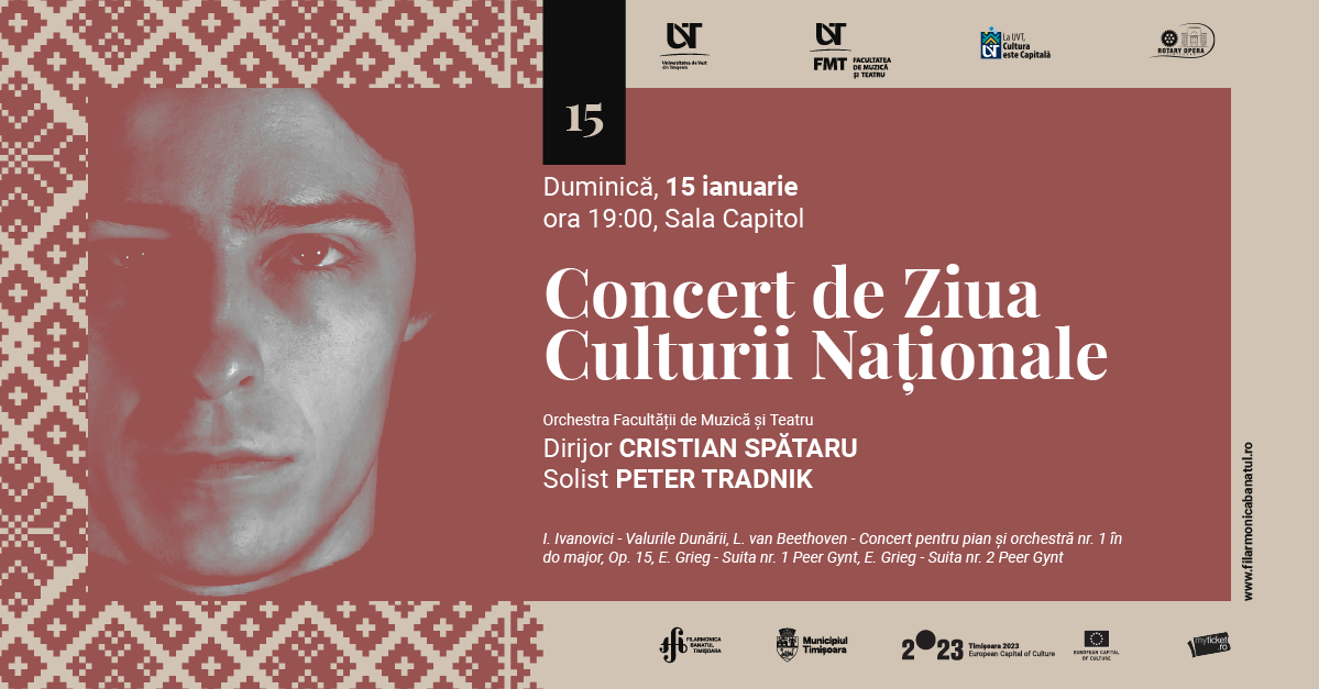 Ziua Culturii Naționale va fi marcată, la Filarmonica Banatul Timișoara, printr-un concert susținut de membrii Orchestrei Facultății de Muzică și Teatru din cadrul Universității de Vest. Dirijorul concertului va fi CRISTIAN SPĂTARU, iar solist va fi PETER TRADNIK – pian.