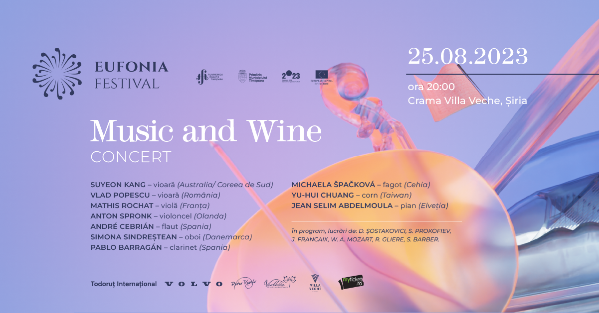 Vă dăm întâlnire vineri, 25 august 2023, de la ora 20:00, la Crama Villa Veche din Șiria, într-un ambient extrem de primitor și reconfortant, numai bun de ascultat muzică clasică și de băut un pahar cu vin rafinat. Vom asculta lucrări de D. Șostakovici, S. Prokofiev, J. Francaix, W. A. Mozart, R. Gliere, S. Barber, în interpretarea asrtiștilor: SUYEON KANG, ANTON SPRONK, SIMONA SINDREȘTEAN, VLAD POPESCU, MATHIS ROCHAT, PABLO BARRAGÁN, JEAN SÉLIM ABDELMOULA, YU-HUI CHUANG, ANDRÉ CEBRIÁN, ANGELICA POSTU, MICHAELA ŠPAČKOVÁ.