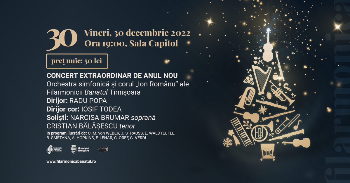 În prag de Anul Nou, Orchestra simfonică și Corul “Ion Românu” ale Filarmonicii Banatul Timișoara, alături de invitata NARCISA BRUMAR – soprană, CRISTIAN BĂLĂȘESCU – tenor, v-au pregătit un program festiv, în cadrul căruia vor fi interpretate lucrări ale compozitorilor C. M. von WEBER, J. STRAUSS, E. WALDTEUFEL, B. SMETANA, A. HOPKINS, F. LEHAR, C. ORFF, G. VERDI etc. Dirijorul concertului va fi RADU POPA, iar dirijorul corului va fi IOSIF TODEA.