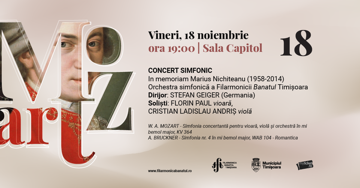 Concertul, aflat sub conducerea maestrului Stefan Geiger, se configureazฤ รฎn felul urmฤtor: Simfonia concertantฤ pentru vioarฤ, violฤ ลi orchestrฤ รฎn mi bemol major, K.V.364 de Wolfgang Amadeus Mozart ลi Simfonia nr.4 รฎn mi bemol major โRomanticaโ de Anton Bruckner.