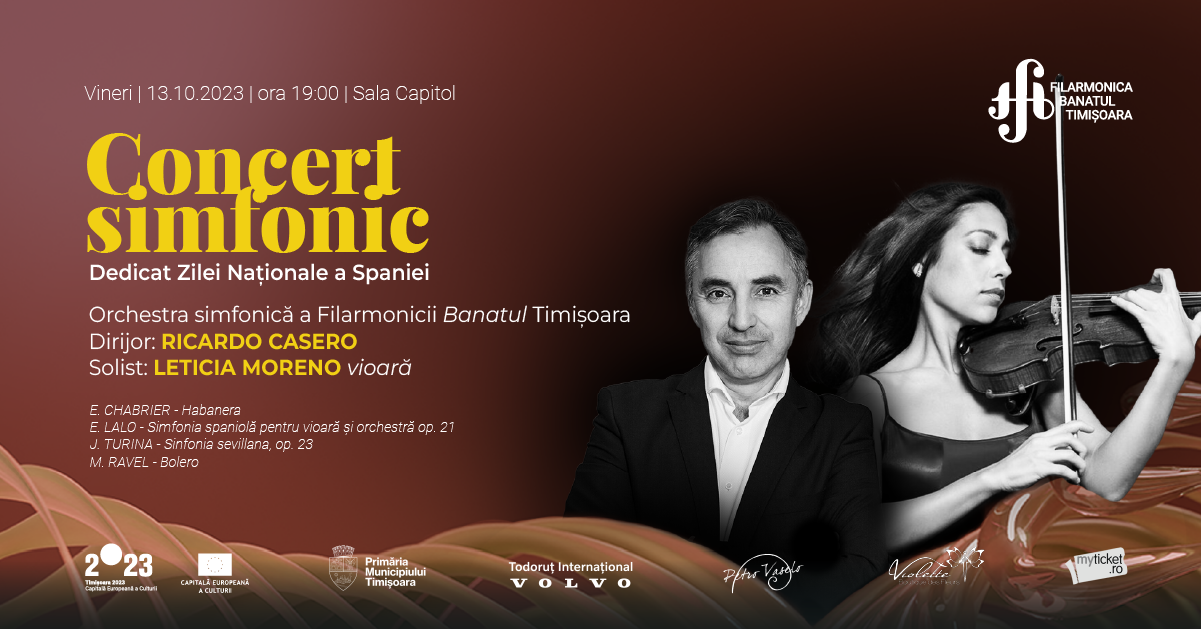 Orchestra simfonică a Filarmonicii Banatul Timișoara, dirijată de RICARDO CASERO, susține vineri, 13 octombrie, de la ora 19:00, la Sala Capitol, un concert simfonic dedicat Zilei Naționale a Spaniei. Solista concertului va fi violonista LETICIA MORENO.