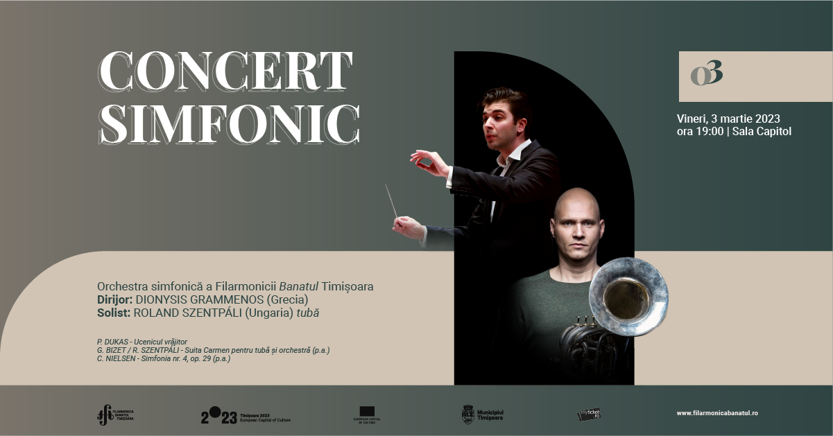 „În programul concertului simfonic condus de maestrul Dionysis Grammenos sunt prevăzute: Poemul simfonic „Ucenicul vrăjitor” de Paul Dukas, Fantezia „Carmen” pentru tubă şi orchestră de George Bizet/Roland Szentpáli şi Simfonia nr.4 .op 29 „The Inextinguishable” de Carl August Nielsen.