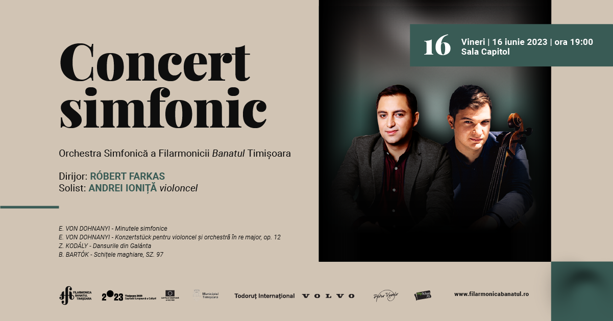 Orchestra simfonică a Filarmonicii Banatul Timișoara, dirijată de RÓBERT FARKAS, va deschide concertul de vineri, 16 iunie 2023, cu lucrarea Minutele simfonice de E. VON DOHNANYI. Apoi, Konzertstück pentru violoncel și orchestră în re major, op. 12, lucrare a aceluiași compozitor va fi interpretată la violoncel de ANDREI IONIȚĂ – solist în rezidență în 2023 al Filarmonicii Banatul Timișoara.
