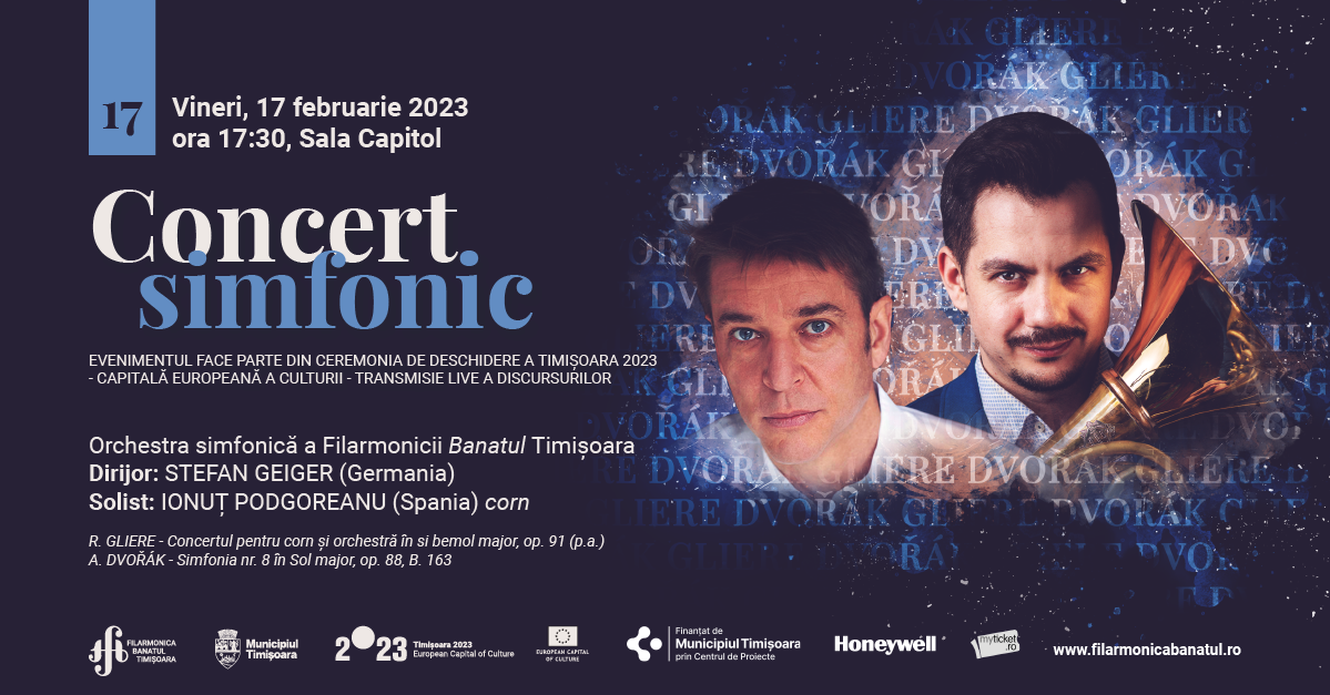 Orchestra simfonică a Filarmonicii Banatul Timișoara și solistul IONUȚ PODGOREANU (Spania) – corn, conduși de maestrul STEFAN GEIGER (Germania) vor interpreta în primă audiție Concertul pentru corn și orchestră în si bemol major, op. 91 de R. GLIERE.
