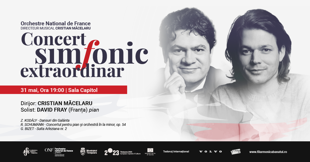 Luna mai se încheie cum nu se poate mai fastuos, cu un concert extraordinar al renumitei ORCHESTRE NAȚIONALE A FRANȚEI (ORCHETRE NATIONAL DE FRANCE), sub bagheta dirijorală a maestrului CRISTIAN MĂCELARU. Solist al concertului va fi pianistul francez DAVID FRAY.
