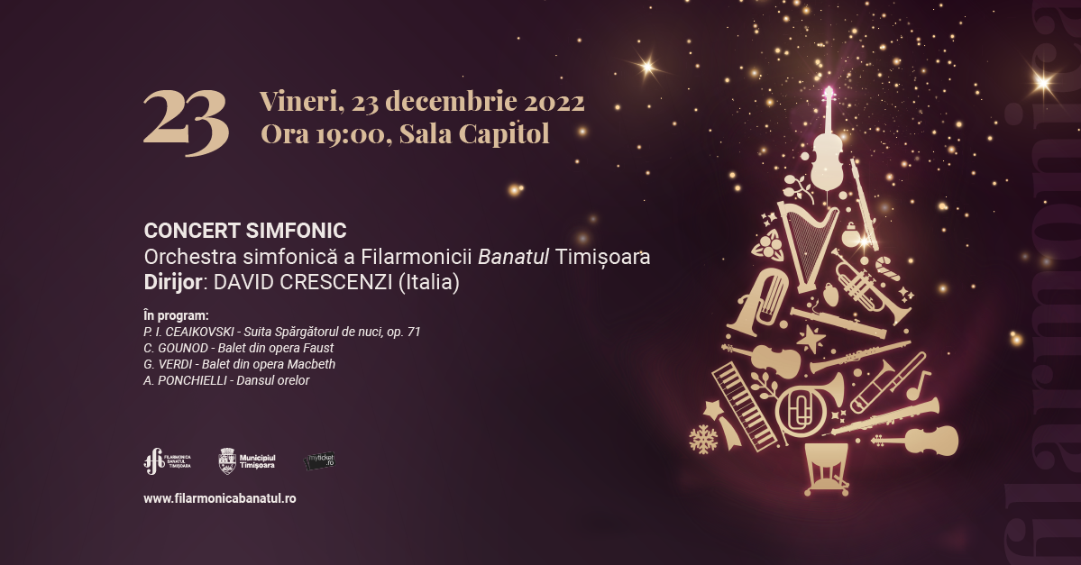 „În aşteptarea minunatelor sărbători ale Crăciunului, Filarmonica Banatul ne pregăteşte o feerică seară muzicală, un program de dansuri şi balete celebre din opere. Dirijor va fi maestrul David Crescenzi, un muzician dăruit în special scenelor de operă. În program, Suita „Spărgătorul de nuci” op.71, de Piotr Ilici Ceaikovski, Balet din Opera „Faust” de Charles Gounod, Balet din opera „Macbeth” de Giuseppe Verdi şi Dansul orelor de Amilcare Ponchielli.