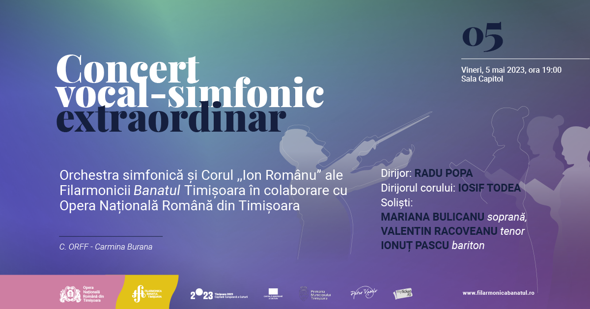 Deschiderea Festivalului Timișoara Muzicală – programată pentru vineri, 5 mai 2023, la ora 19:00, la Sala Capitol – se anunță a fi un eveniment special, prin concertul vocal-simfonic extraordinar cu cantata Carmina Burana de C. ORFF, ocazie cu care vor urca pe podiumul de concert corurile și orchestrele celor două instituții muzicale ale orașului: Filarmonica Banatul Timișoara și Opera Națională Română Timișoara.