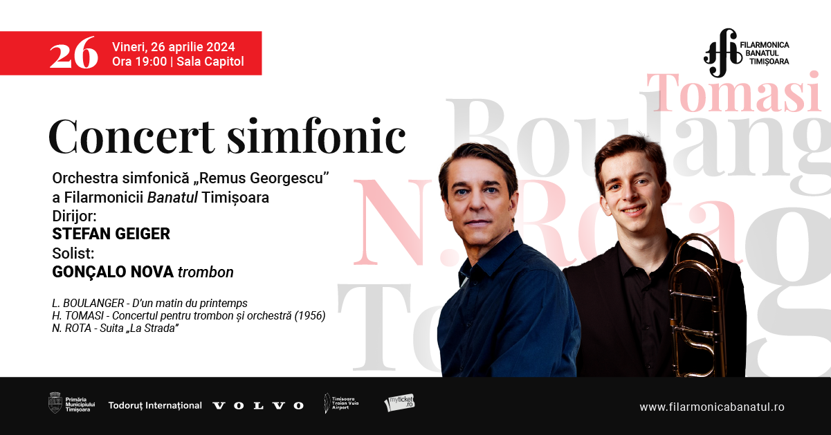 Concert simfonic – Orchestra simfonică a Filarmonicii Banatul Timișoara | Dirijor: STEFAN GEIGER, solist: GONÇALO NOVA – trombon