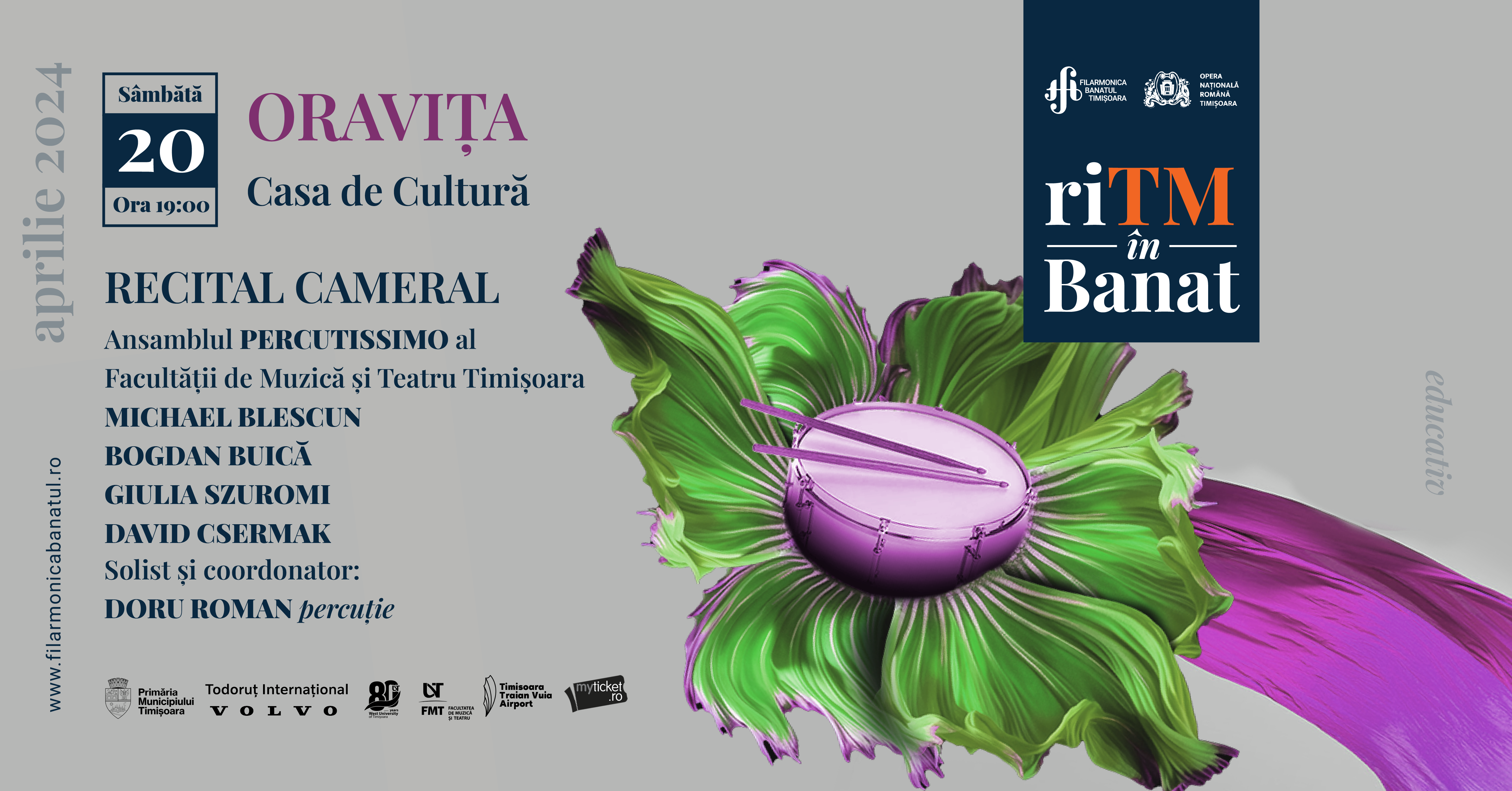 Seria de evenimente riTM în Banat ajunge la Oravița, unde publicul este așteptat sâmbătă, 20 aprilie, de la ora 19:00, la Casa de Cultură pentru o seară antrenantă în compania artiștilor din Ansamblul “Percutissimo”. Coordonat de Doru Roman, Ansamblul Percutissimo al Facultății de Muzică și Teatru din cadrul Universității de Vest din Timișoara este apreciat […]