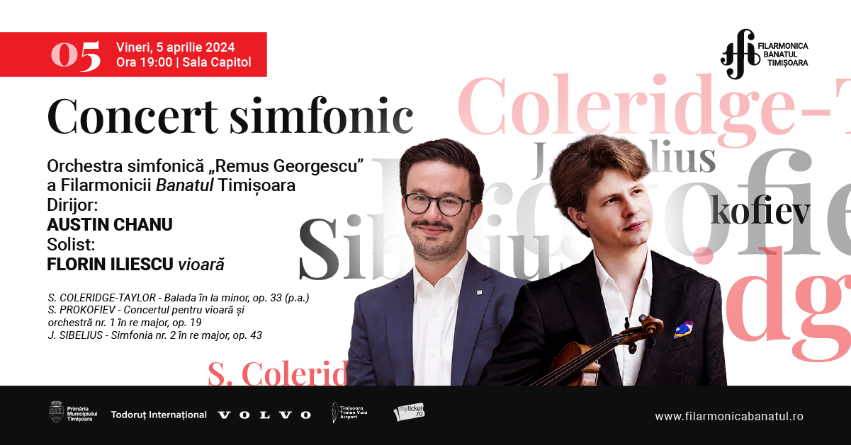 Sala Capitol Bulevardul Constantin Diaconovici Loga Nr. 2, Timișoara, Timiș, RomâniaOrchestra simfonică „Remus Georgescu” a Filarmonicii Banatul Timișoara, sub conducerea dirijorală a maestrului AUSTIN CHANU, va interpreta, în primă audiție, Balada în la minor, op. 33 de Samuel Coleridge-Taylor. Din program face parte și Concertul pentru vioară și orchestră nr. 1 în re major, op. 19, compus de Prokofiev în 1917, anul care, în ciuda […]