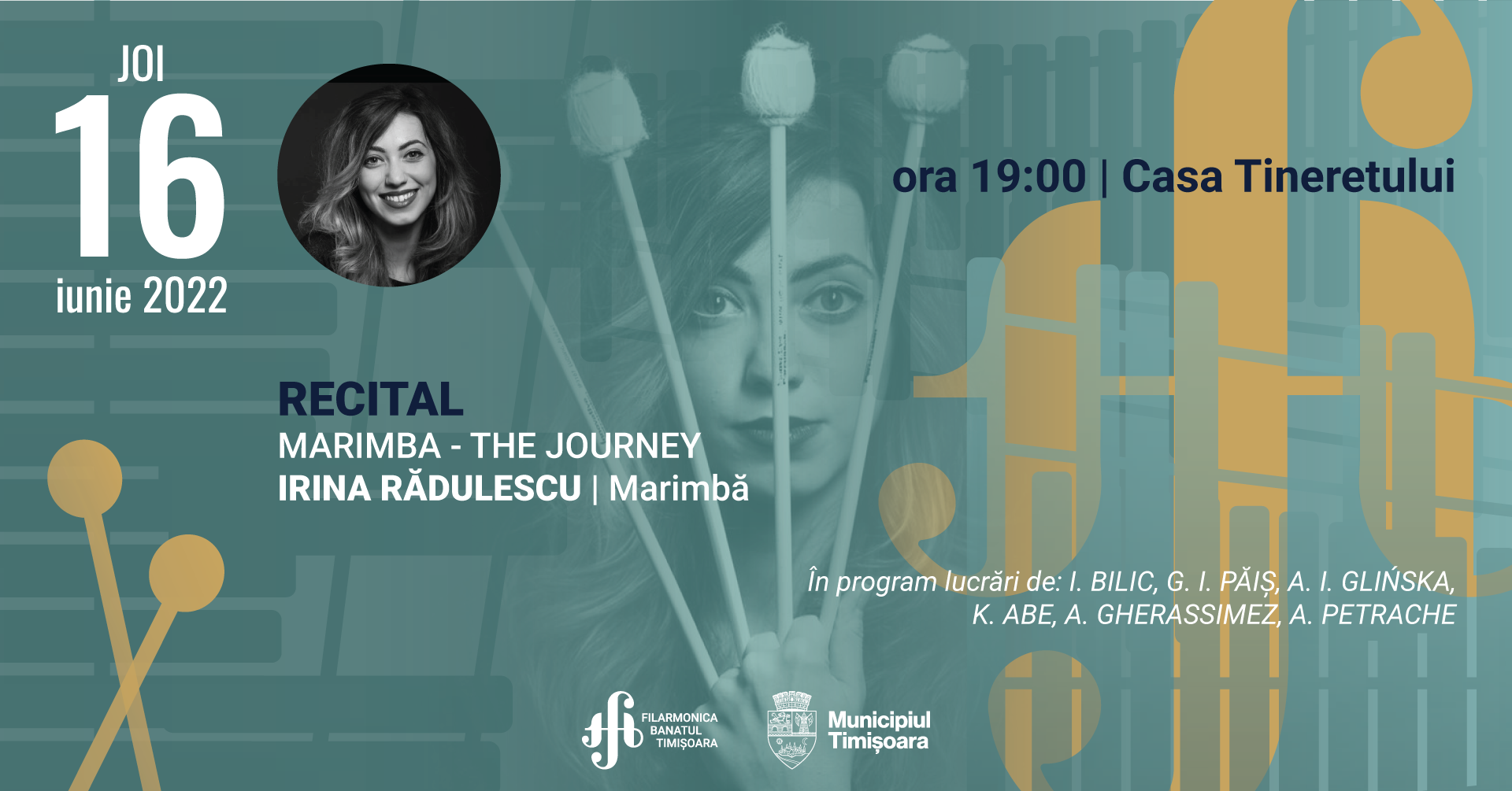 Desfășurat în perioada 1 – 18 Iunie 2022, turneul “Marimba – The Journey” va oferi publicului din Mediaș, Bistrița, Sibiu, Brașov, Pitești, Timișoara, Sinaia și București întâlnirea cu marimba, unul dintre cele mai fascinante și totodată prea puțin cunoscute instrumente. Irina Rădulescu, singurul artist român din generația tânără dedicat acestui instrument, va explora sonoritățile magice ale marimbei solo, într-un program alcătuit din lucrări semnate de compozitori consacrați în spațiul internațional precum Keiko Abe, Gene Koshinski, Jovan Nebojsa Zivkovic, Anna Ignatowicz-Glinska sau John Psathas, dar și lucrări dedicate acestui eveniment de către trei compozitori români tineri: Sebastian Androne-Nakanishi, Andrei Petrache și George Păiș.