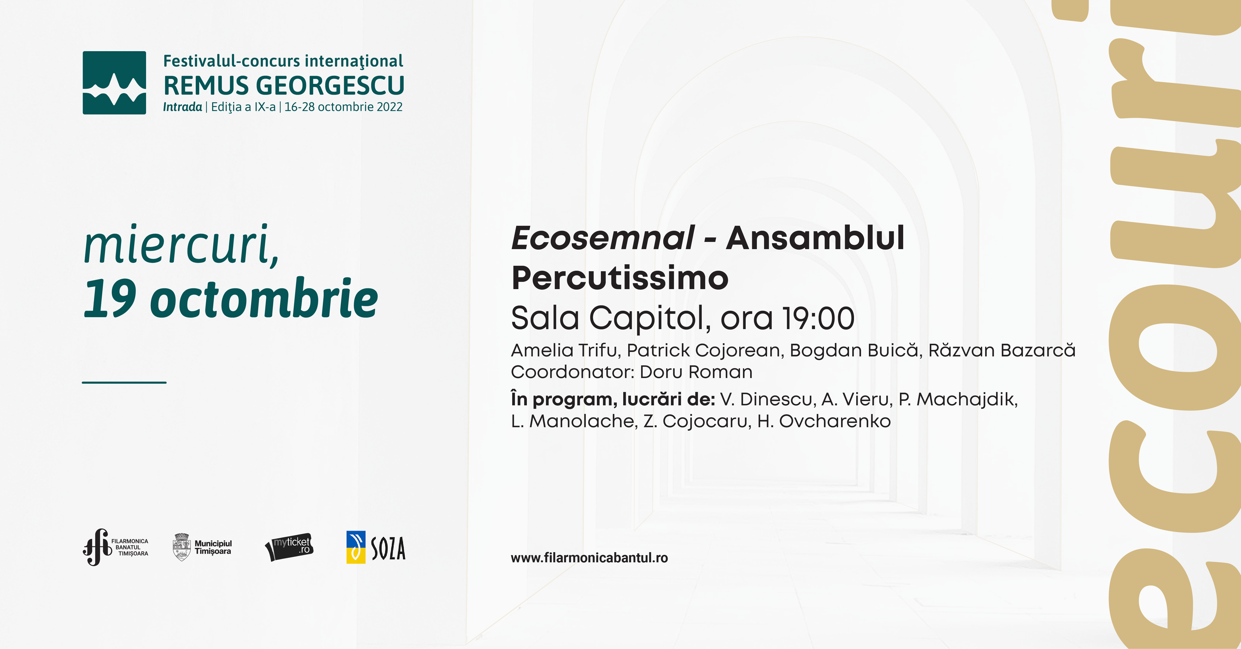 Ansamblul de percuție 𝐏𝐞𝐫𝐜𝐮𝐭𝐢𝐬𝐬𝐢𝐦𝐨, condus de percuționistul solist al 𝑭𝒊𝒍𝒂𝒓𝒎𝒐𝒏𝒊𝒄𝒊𝒊 𝑩𝒂𝒏𝒂𝒕𝒖𝒍 𝑻𝒊𝒎𝒊𝒔̦𝒐𝒂𝒓𝒂, 𝙳𝚘𝚛𝚞 𝚁𝚘𝚖𝚊𝚗, pune în lumină, pe scena Sălii Capitol, tineri muzicieni precum Amelia Trifu, Patrick Cojerean, Bogdan Buică și Răzvan Bazarcă, în cadrul concertului intitulat 𝐸𝑐𝑜𝑠𝑒𝑚𝑛𝑎𝑙.