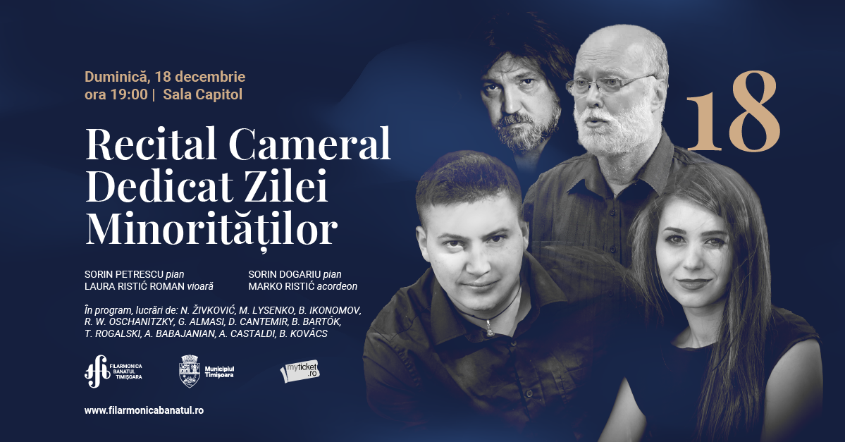 Într-un oraș multicultural și multietnic, Filarmonica Banatul Timișoara marchează Ziua Minorităților printr-un recital cameral, duminică, 18 decembrie, de la ora 19:00, în Sala Capitol, atunci când pe scenă vor urca LAURA RISTIĆ ROMAN – vioară, MARKO RISTIĆ – acordeon, SORIN PETRESCU – pian, SORIN DOGARIU – pian.