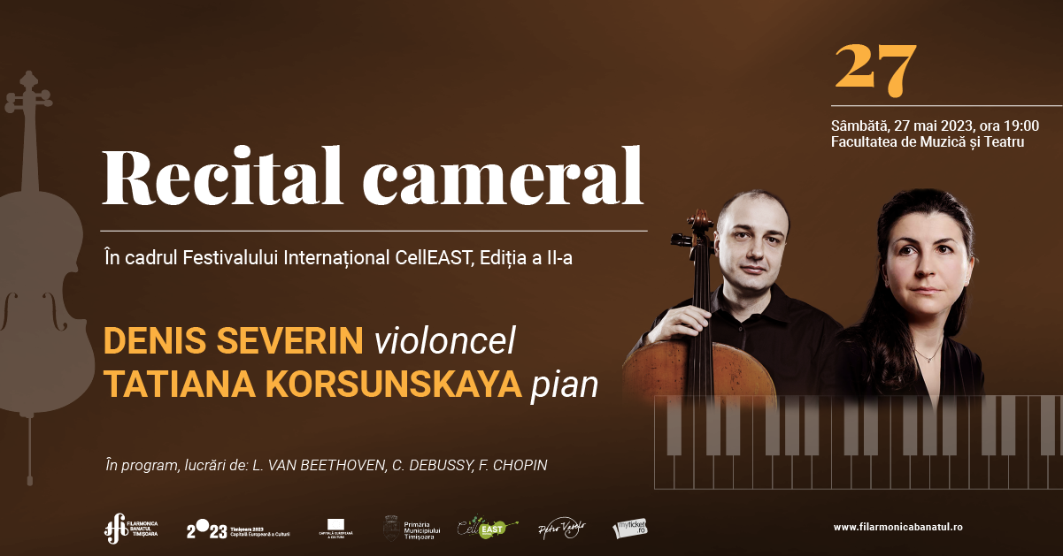 Doi artiști internaționali de mare valoare, violoncelistul DENIS SEVERIN și pianista TATIANA KORSUNSKAYA – ambii cu o înclinație aparte spre muzica de cameră, ne vor încânta sâmbătă, 27 mai 2023 cu interpretări de înaltă măiestrie a unor lucrări de L. VAN BEETHOVEN, C. DEBUSSY și F. CHOPIN.