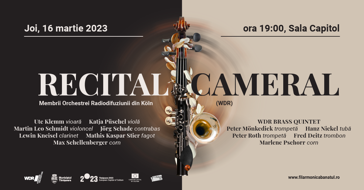 Sptetul Orchestrei Radiodifuziunii din KÖLN (WDR), alcătuit din soliștii: UTE KLEMM – vioară, KATJA PÜSCHEL – violă, MARTIN LEO SCHMIDT – violoncel, JÖRG SCHADE – contrabas, LEWIN KNEISEL – clarinet, MATHIS KASPAR STIER – fagot și MAX SCHELLENBERGER – corn francez, vor interpreta în cadrul recitalului cameral de joi, 16 martie 2023, Septet în mi bemol major, op. 20 de L. VAN BEETHOVEN.