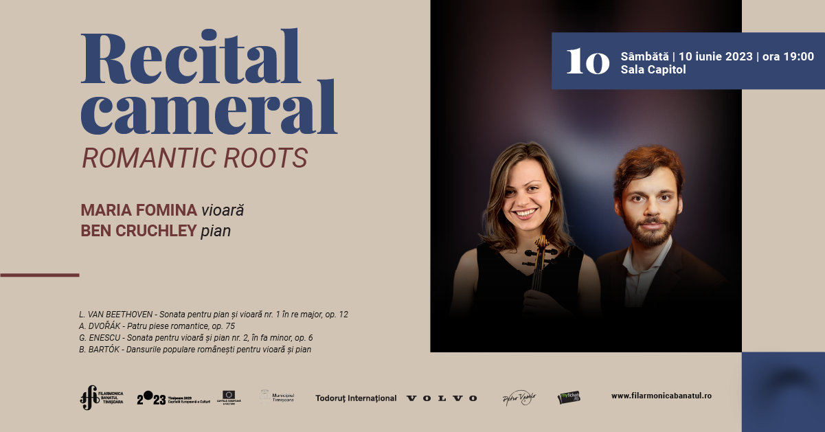 MARIA FOMINA, prim-violonista Tonkünstler Orchester, și pianistul canadian BEN CRUCHLEY ne propun, sâmbătă, 10 iunie 2023, de la ora 19:00, o incursiune în perioada Romantismului, purtându-ne spre începuturile sale prin interpretarea lucrărilor compozitorilor L. VAN BEETHOVEN, A. DVOŘÁK, G. ENESCU și B. BARTÓK.