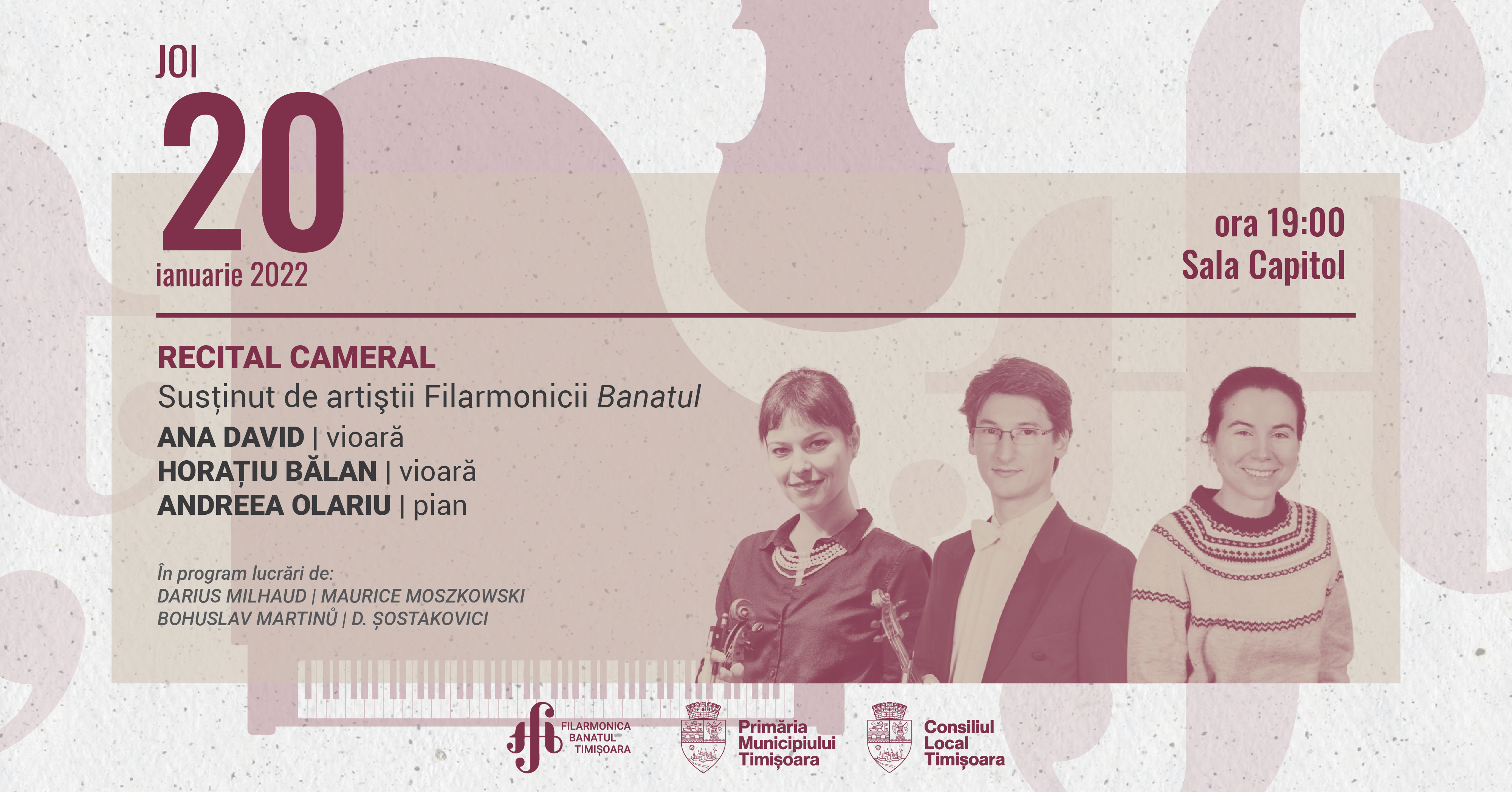 Joi, 20 ianuarie, de la ora 19, vă invităm la recitalul cameral susținut de Ana David (vioară), Horațiu Bălan (vioară) și Andreea Olariu (pian), artiști ai Filarmonicii Banatul, care vor interpreta următoarele lucrări: