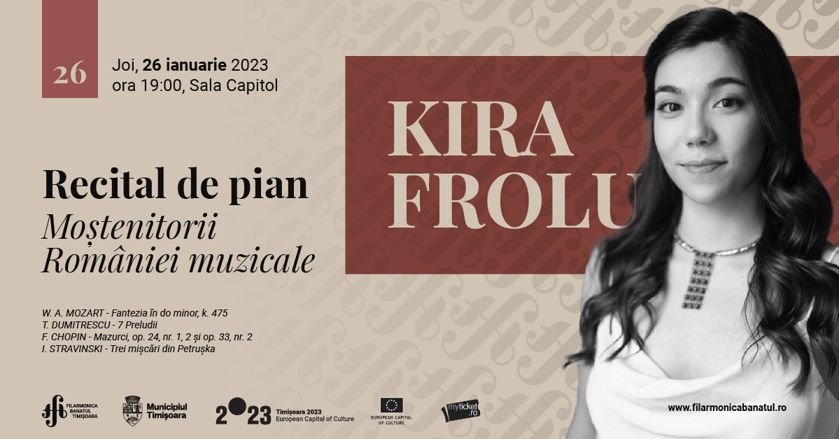 Vă invităm să luați parte la un minunat recital de pian intitulat Moștenitorii României muzicale. Tânăra și foarte talentata pianistă KIRA FROLU, care a susținut recitaluri în săli de prestigiu din numeroase țări europene, precum Wigmore Hall, Milton Court, St. James’ Piccadilly, St. Martin in the Fields, Londra, Royal Conservatoire of Scotland, Glasgow, Fabrica de piane “Fazioli”, Sacile, dar și Sala Radio, Arcub și Ateneul Roman, București, urcă pe scena Sălii Capitol, joi, 26 ianuarie, de la ora 19:00.