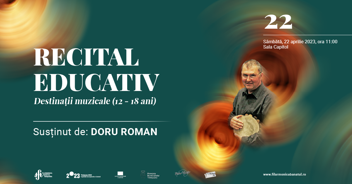 Copiii și adolescenții au program special, sâmbătă, 22 aprilie, de la ora 11:00, la Sala Capitol. Solistul DORU ROMAN – percuționist al Filarmonicii Banatul Timișoara îi va purta într-o călătorie muzicală ce va face înconjurul lumii.