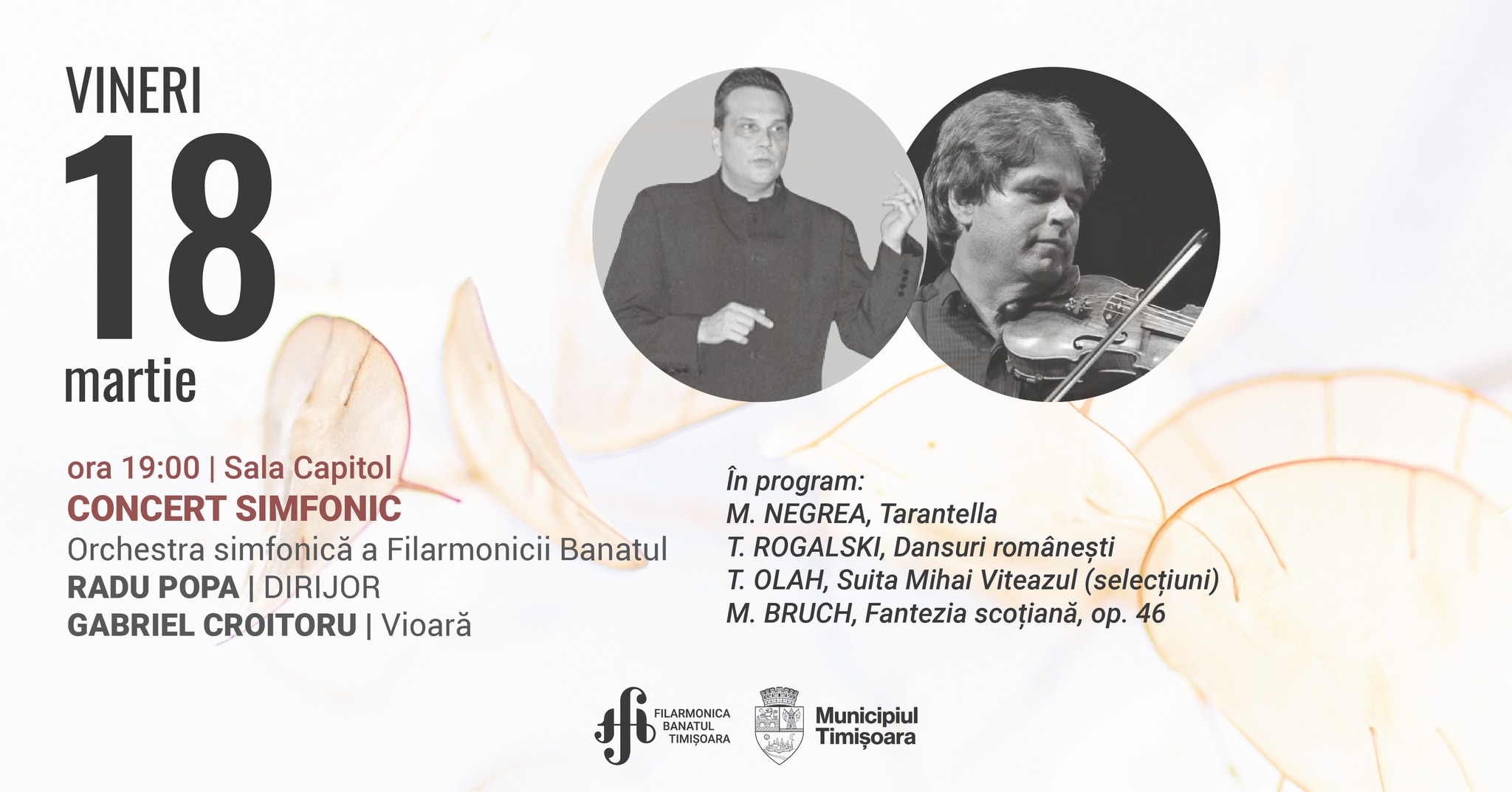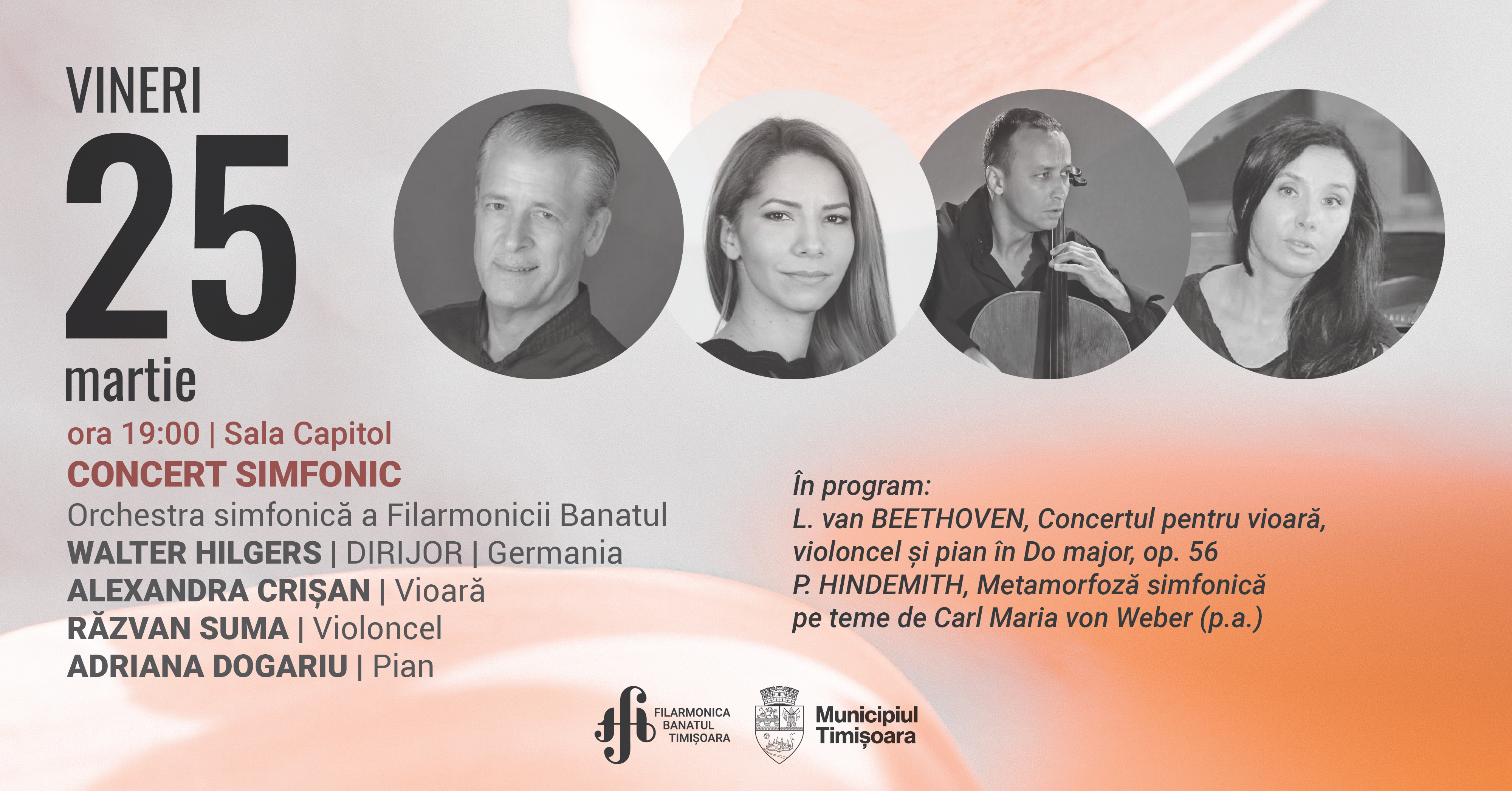 Filarmonica Banatul Timișoara Filarmonica Banatul Adresă, Timișoara, Timiș, RomaniaVineri, 25 martie, de la ora 19, vă așteptăm la concertul simfonic susținut de orchestra Filarmonicii Banatul sub bagheta dirijorului german Walter Hilgers, alături de violonista Alexandra Crișan, violoncelistul Răzvan Suma și de pianista Adriana Dogariu. În program vor fi următoarele lucrări: L. van Beethoven - Concertul pentru vioară, violoncel și pian în Do major, […]